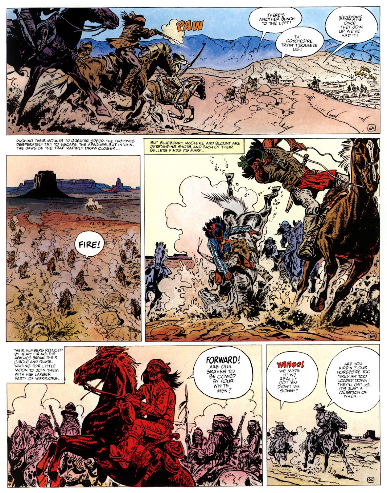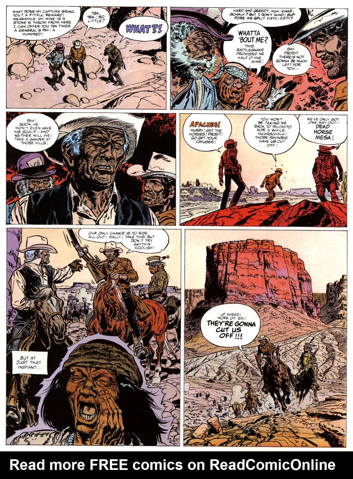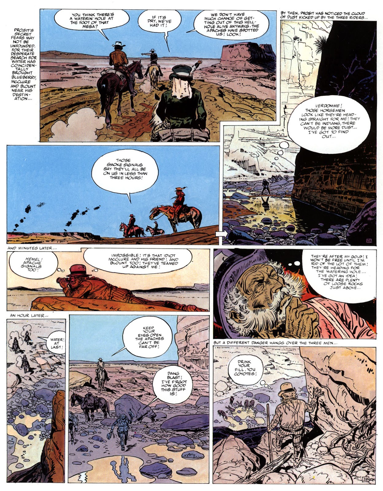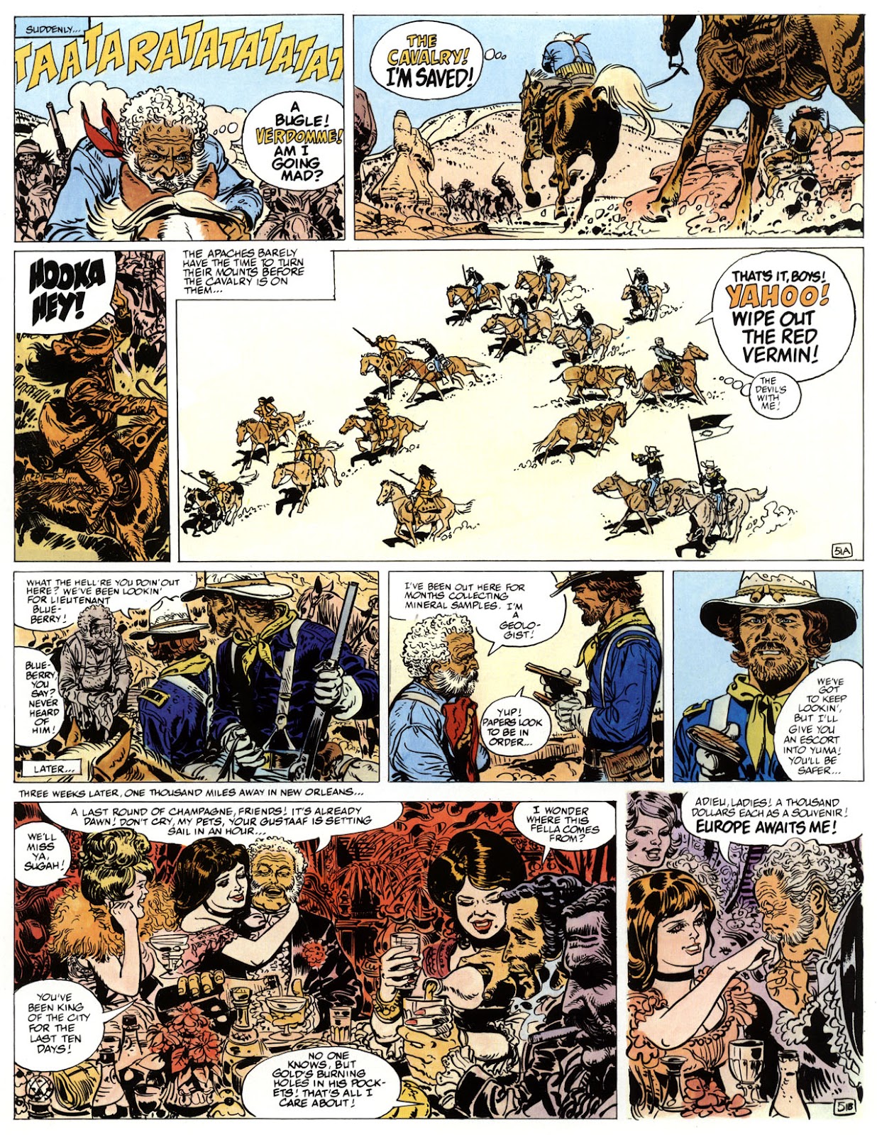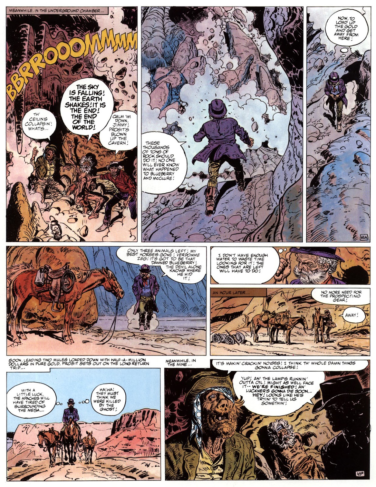 EACH OF THE CLICK THROUGH NUMBERS BELOW REPRESENT A PAGE IN THE EPIC GRAPHIC NOVEL OF MARSHAL BLUEBERRY BOOK 1, THE LOST DUTCHMAN'S MINE. CLICKING EACH INDIVIDUAL NUMBER WILL TAKE YOU TO THE CORRESPONDING PAGE, THUS ALLOWING YOU TO READ THE NOVEL PAGE BY PAGE START TO FINISH. EACH PAGE THAT COMES UP IS EXPANDABLE TO A LARGER SIZE BY CLICKING IT WITH YOUR MOUSE.