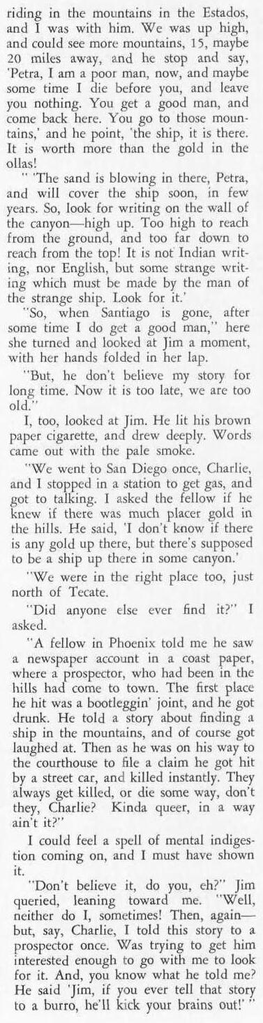 Socia, after being gone several days or more, came home and told his wife that he had been wandering in some canyons some distance off and in one of them he came across what appeared to be an ancient ship of some kind that had round discs on its side (like a Viking ship). Part of the ship was sticking out of the sand. There was some kind of strange markings, possibly writing, on the wall above the ship he did not recognize. He also said it had a curved bow. The wife did not find his story credible so over the months that followed he went out looking for it over and over but was never able to locate it. However, one day he did return with a weathered round wooden shield the wife said was twice the size of a large tortilla that the husband said he had found secreted along a canyon trail in the mountains quite some distance north of where he thought the ship was located.