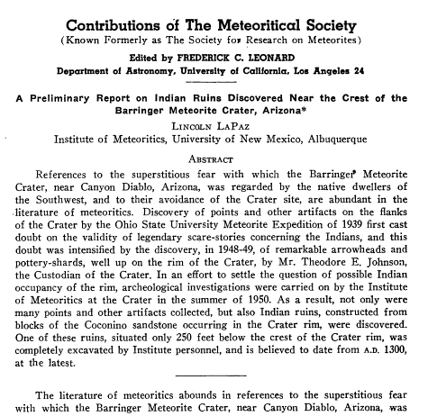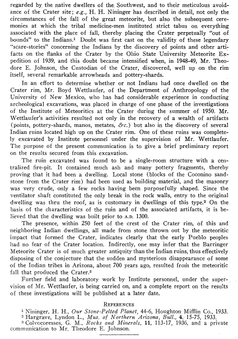 In the last paragraph it is stated that at the time of the paper further field and laboratory work by the Institute was being carried out and results of that continuing investigation would be published at a later date. That follow-up report was made at the 15th meeting of the Society held September 2-4, 1952 at the University of New Mexico. During the morning session, September 4, Dr. La Paz presented before the meeting (i.e., read) the follow-up titled: "A Pueblo II Pithouse on the Rim of the Barringer Meteorite Crater," by Wettlaufer. A printed or online copy of that presentation, albeit requested, has not been forthcoming.